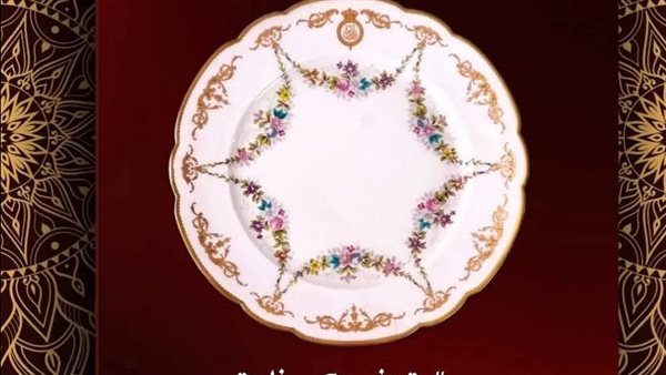 أما ساحة الصحن، فتزينها أفرع نباتية وزهور ملونة تتشابك لتكوّن أشكال عقود متقنة، ما يعكس المزج بين الجمال الطبيعي والتصميم الملكي الفاخر، ليصبح الصحن تحفة فنية متكاملة تعكس ذوق الملك فاروق الرفيع.