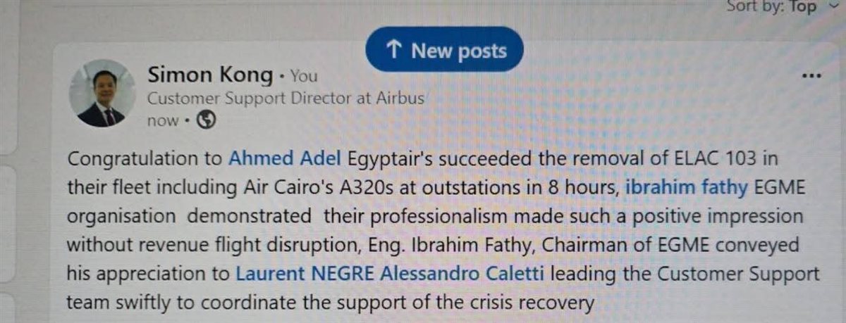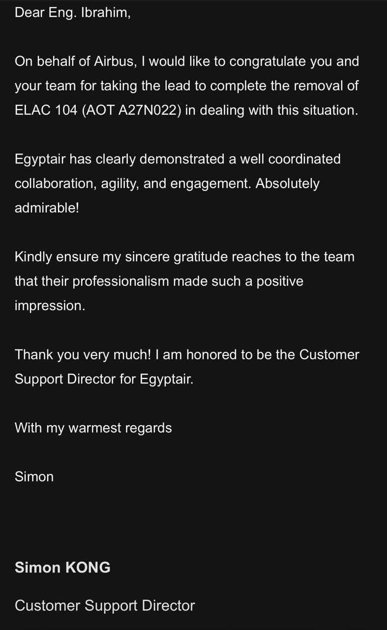 وجّهت شركة أيرباص العالمية الشكر إلى شركة مصر للطيران ، و عبرت عن تقديرها الكبير لمستوى التنسيق الفعال والاستجابة السريعة التي قدمها فريق عمل مصر للطيران خلال تنفيذ التحديثات البرمجية اللازمة التى أصدرتها شركة أيرباص مؤخرًا على طرازات A320 وذلك خلال وقت قياسي.