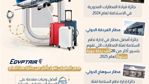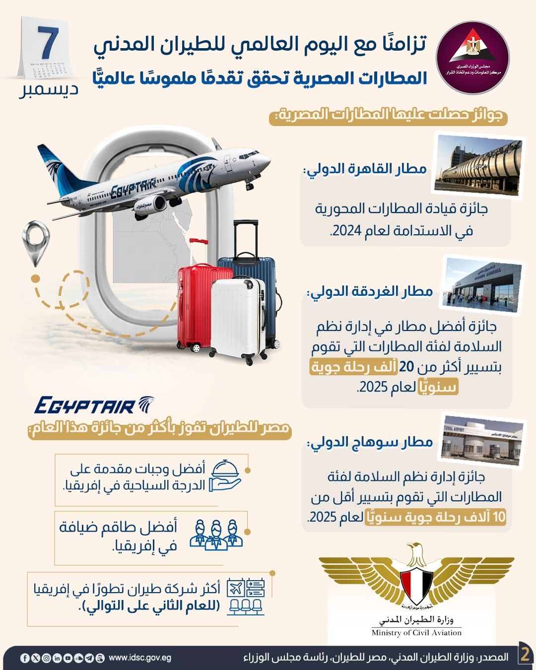 وبالتزامن مع افتتاح المتحف المصري الكبير نوفمبر 2025، استقبل مطارا القاهرة وسفنكس 50 رحلة دولية، كما حصدت المطارات المصرية عدة جوائز دولية، منها فوز مطار القاهرة بجائزة الاستدامة، ومطار الغردقة ومطار سوهاج بجوائز إدارة نظم السلامة لعام 2025.