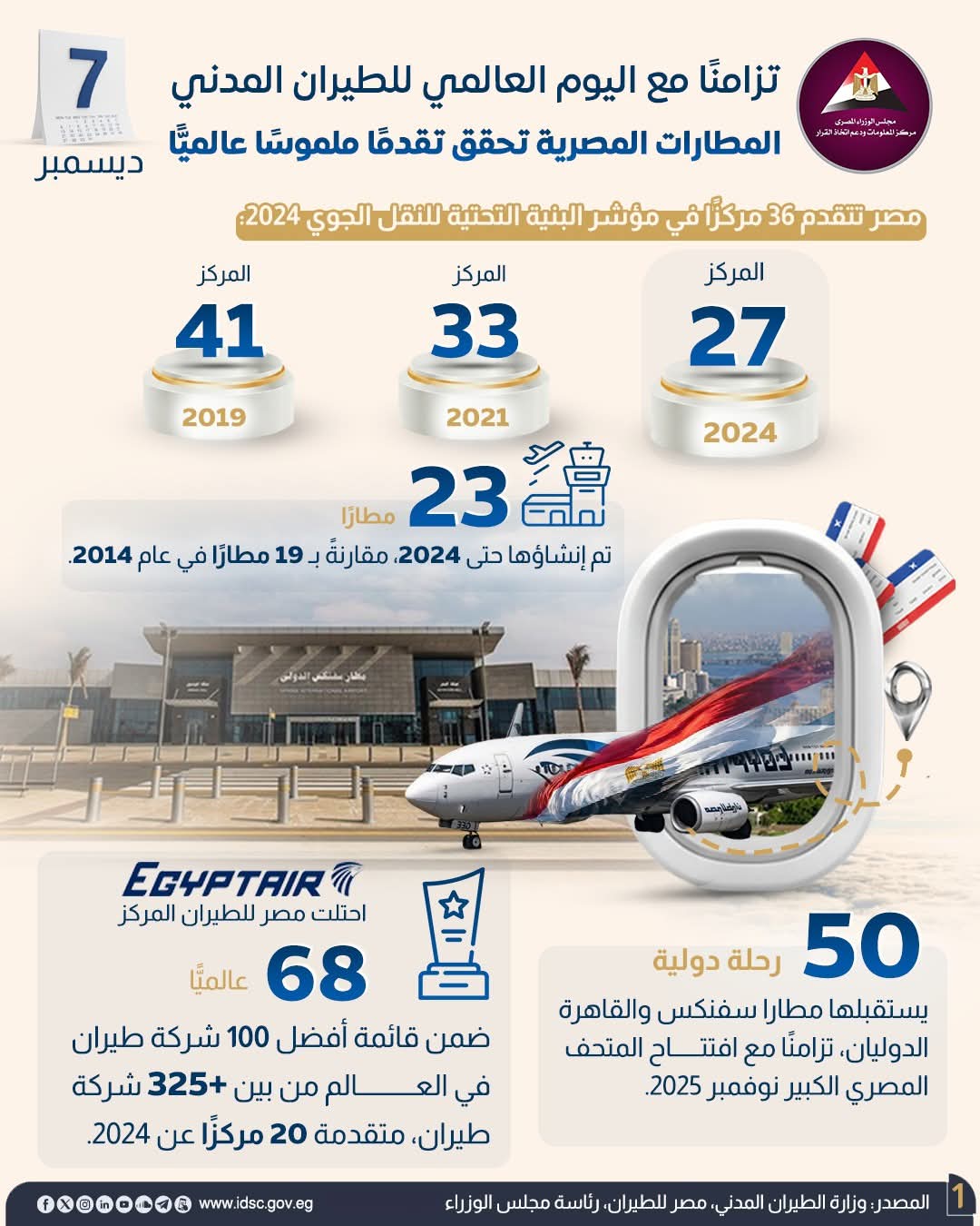حقق قطاع الطيران المصري طفرة واضحة بتقدّم مصر 36 مركزًا في مؤشر البنية التحتية للنقل الجوي لتصل إلى المرتبة 27 عالميًا عام 2024.