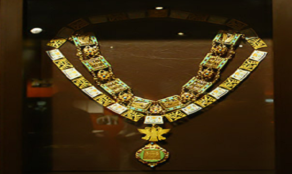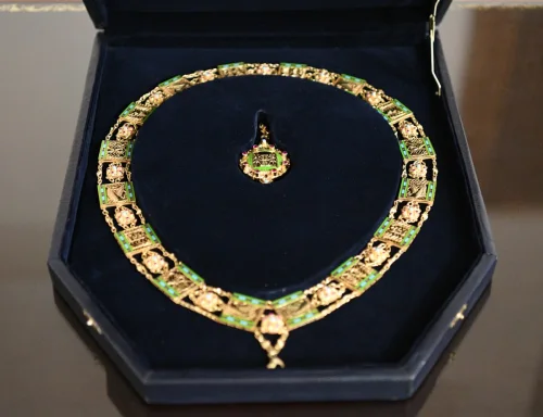 القلادة عبارة عن سلسلة تتعاقب فيها ثلاث وحدات مربعة الشكل، كل وحدة منها محلاة بالميناء وبرموز فرعونية، وتتصل الوحدات ببعضها من الأركان بسلسلتين متوازيتين، يتوسط كل سلسلة منهما زهرة لوتس صغيرة، وتتكرر الوحدات الثلاث على النحو الآتي: الأولى: ترمز إلى حماية البلاد من الشرور، والثانية: ترمز إلى الرخاء والسعادة التي يجلبها النيل، الثالثة: ترمز إلى الخير والدوام.