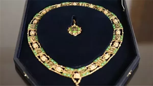 وللقلادة حلية تتصل بالسلسلة بمشبك على شكل زهرتي لوتس، والحلية ذات شكل دائري ومحلاة بزهرات فرعونية وبالميناء وبالفصوص الحمراء والزرقاء، وفي وسطها رسم بارز يمثل رمز النيل موحدًا بين الشمال الذي يمثله البردي والجنوب الذي يمثله زهرة اللوتس.