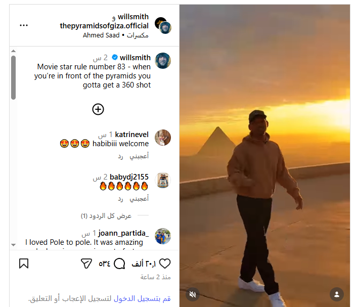وأرفق ويل سميث مقطع الفيديو بتعليق قائلًا: “القاعدة رقم 83 لنجوم السينما - عندما تكون أمام الأهرامات، عليك التقاط صورة بزاوية 360 درجة”.