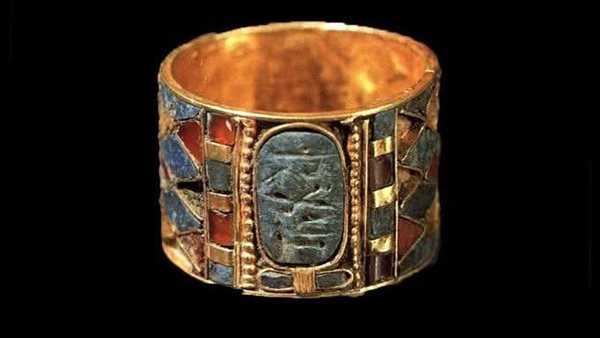 وصُنع الخاتم من الذهب الخالص ويتوسطه خرطوش ملكي يحمل اسم الملك محفورًا بدقة متناهية، في تعبير واضح عن رمزية السلطة والقدسية التي ارتبطت بالملوك في تلك الفترة. ويبلغ عرض الخاتم نحو 1.6 سم، إلا أنه يحمل قيمة تاريخية وفنية كبيرة، تعكس مكانة صاحبه والدور الرمزي للحُلي الملكية في الطقوس الدينية والمناسبات الرسمية داخل البلاط الملكي.