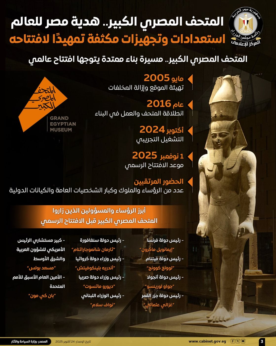 نشر المركز الإعلامي لمجلس الوزراء عددًا من الإنفوجرافات عبر منصاته على مواقع التواصل الاجتماعي، بعنوان "المتحف المصري الكبير.. هدية مصر للعالم.. استعدادات وتجهيزات مكثفة تمهيدًا لافتتاحه".