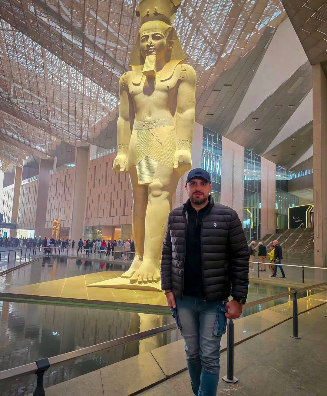 تركيب سياج لمنع سقوط الزائرين بالمياة تمثال رمسيس الثاني بالمتحف الكبير