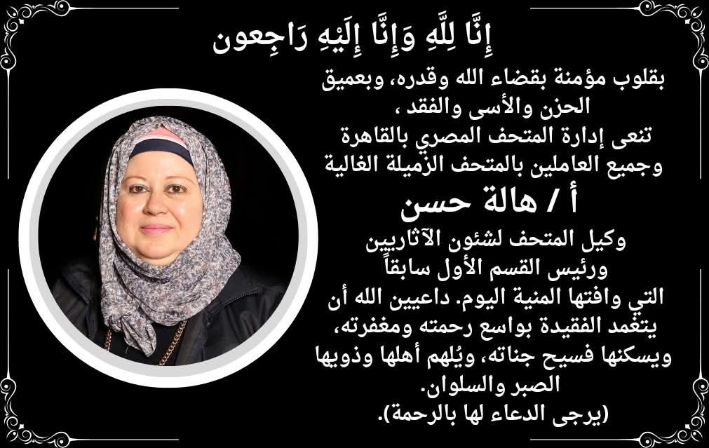 نعي الدكتور علي عبد الحليم علي، مدير عام المتحف المصري بالقاهرة، وجميع العاملين بالمتحف، ببالغ الحزن والأسى، وفاة الزميلة العزيزة هالة حسن، وكيلة المتحف لشئون الآثاريين ورئيس القسم الأول سابقاً، التي وافتها المنية اليوم.