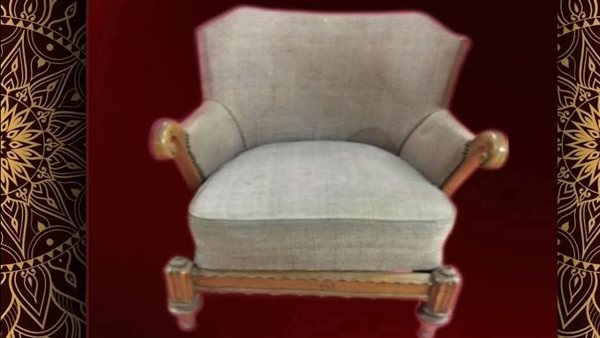 ويتميز الكرسي بشاسيه خشبي يرتكز على أربعة أرجل، حيث تبدو الأرجل الأمامية بارزة بينما تأتي الخلفية أصغر حجمًا، ويتوّج التصميم ظهر شبه منحرف منجد بالقطن ومكسو بقماش باللون البيج، مع شلتة منفصلة بيضاوية الشكل بنفس اللون، ما يضفي على القطعة لمسة من الراحة والفخامة في آن واحد. كما يتصل الظهر بمساند جانبية منجدة تنتهي بأيدٍ خشبية معكوفة تعكس براعة الصانع ودقة التفاصيل.