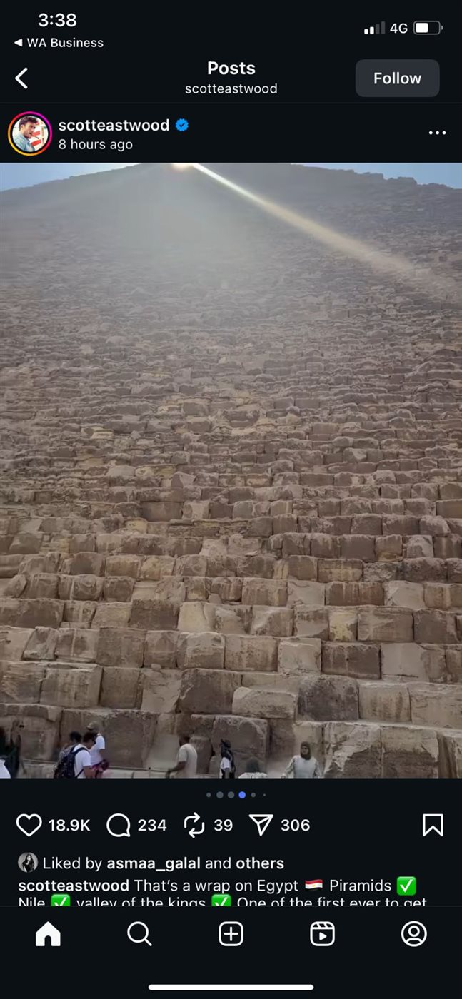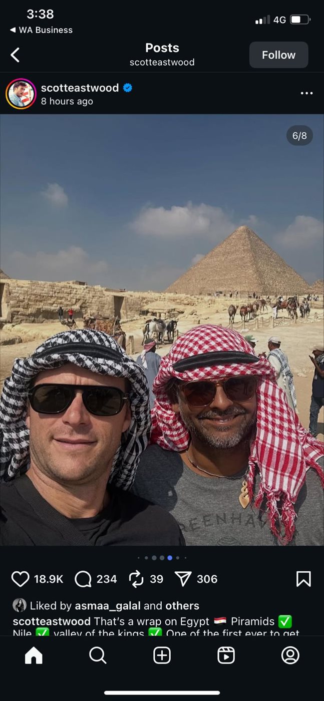 زار النجم العالمي سكوت إيستوود مصر مؤخرًا، ونشر عبر حسابه الرسمي على إنستجرام صورًا مبهرة توثق رحلته التاريخية، أبرزها صورة له وهو يحلق فوق أهرامات الجيزة، في مشهد ساحر يظهر عظمة المعالم التاريخية المصرية من السماء.