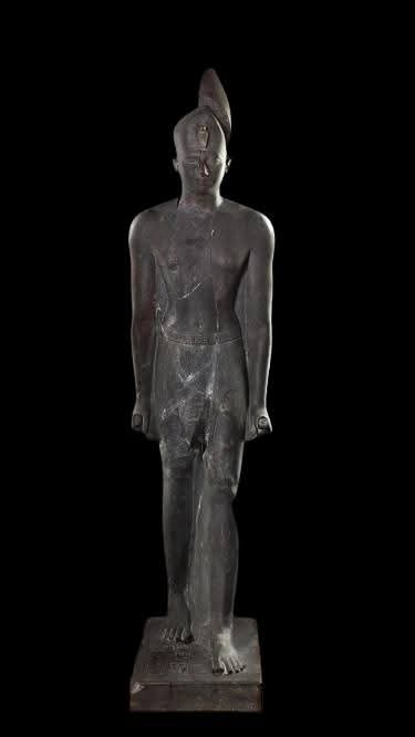 يعد هذا التمثال، المصنوع من حجر "الشست الرمادي"، أيقونة للفن في الدولة الحديثة (منتصف الأسرة 18). وقد نُحت ليجسد الملك في هيئة المحارب المنتصر؛ حيث نرى أسفل قدميه تصويراً لـ "الأقواس التسعة" التي ترمز لأعداء مصر التقليديين، في إشارة صريحة لسيطرته وقوة ملكه التي امتدت لتشمل أطراف العالم القديم.