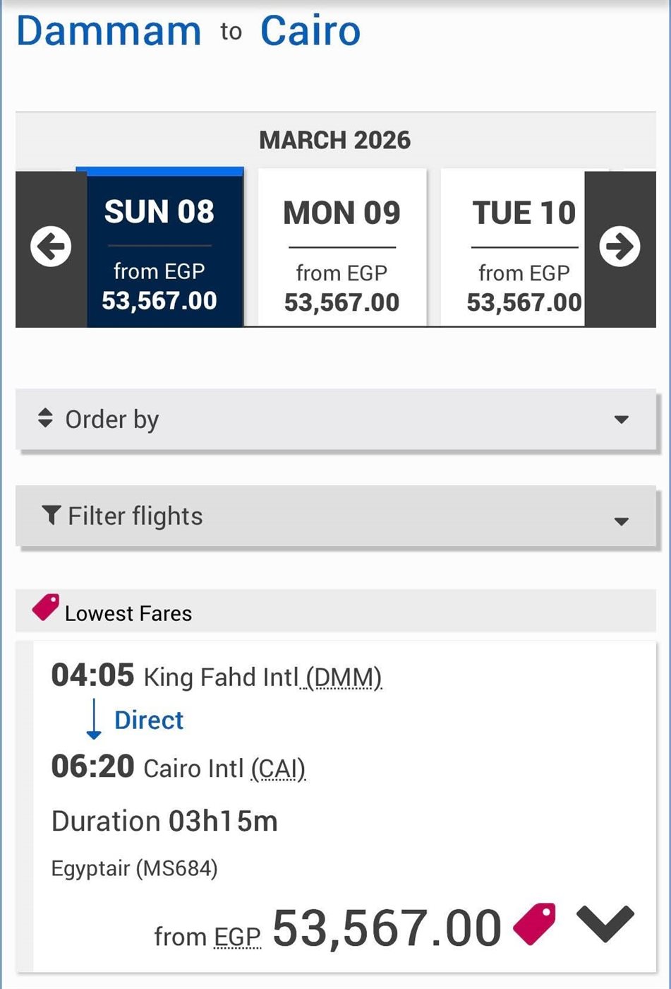 وأوضح النشطاء أن الشركة الوطنية مصر للطيران قررت أيضا زيادة أسعار تذاكر رحلاتها من مطار الدمام الدولي الي 54 الف جنيها وقام بزيادتها مؤخرا الي 73 ألف جنيها، فين حين أن السعر الطبيعي للتذكرة أقل من 10 آلاف.