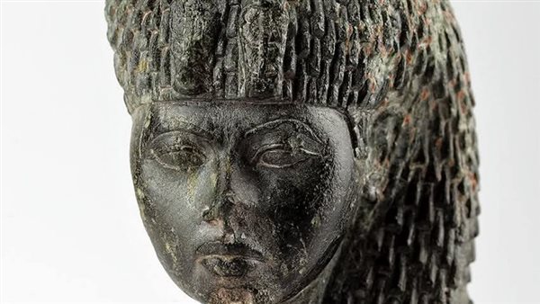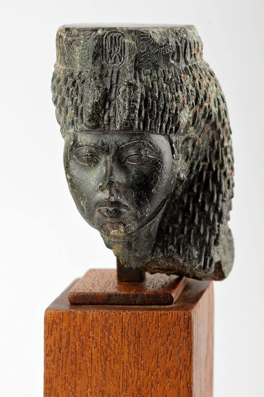 هذا الرأس الرائع ، المصنوع بدقة متناهية، يعكس ملامحها الصارمة والواثقة. تظهر فيه مرتدية شعراً مستعاراً بضفائر ضيقة، ويزين جبينها الكوبرا المزدوجة المجنحة، وهي رمزية قوية للحماية الملكية. ومن المثير للدهشة أن هذا الرأس عُثر عليه في معبد حتحور بسرابيط الخادم في سيناء، مما يؤكد امتداد نفوذها وتقديرها في شتى بقاع الأرض المصرية.