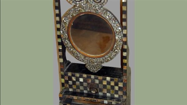 وتتكون القطعة المعروضة من شكمجية خشبية مطعمة بالصدف تضم درجين تعلوهما مرآة صغيرة مثبتة بين قائمين، وترتكز على أربعة أرجل ينتهي كل منها بشكل كروي مع زخارف مذهبة، ما يعكس دقة الصنعة وجمال الزخارف التي تميزت بها التحف المنزلية في ذلك الوقت.