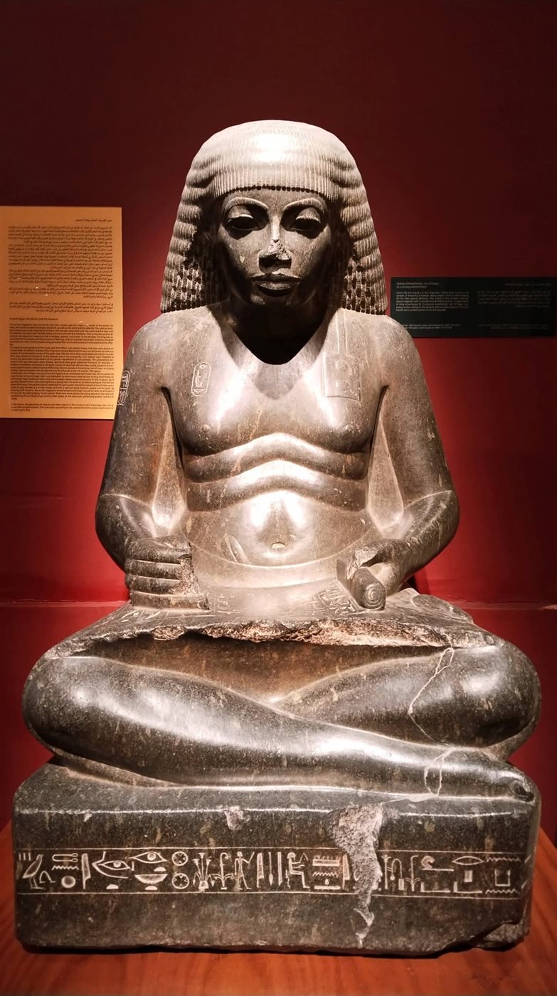 يستقبل المتحف المصري بالقاهرة زواره بقطعة فنية تجسد قمة الرقي الإداري والروحاني في مصر القديمة، وهي تمثال "أمنحتب ابن حابو" في هيئة الكاتب الشاب. نُحت هذا الأثر من حجر الجرانوديوريت الصلب ليعكس ملامح مسؤول جمع بين عبقرية التخطيط وقدسية الحكمة خلال عهد الملك أمنحتب الثالث في الأسرة الثامنة عشرة.