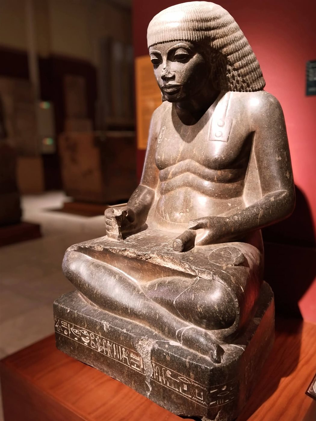 يظهر أمنحتب في هذا الوضع جالساً على الأرض في خشوع، ممسكاً بلفافة بردي مفتوحة تعبر عن علمه الواسع، بينما تستقر محبرته فوق كتفه الأيسر كرمزٍ لمهنته التي كانت مفتاح رقيه في الدولة المصرية القديمة.
