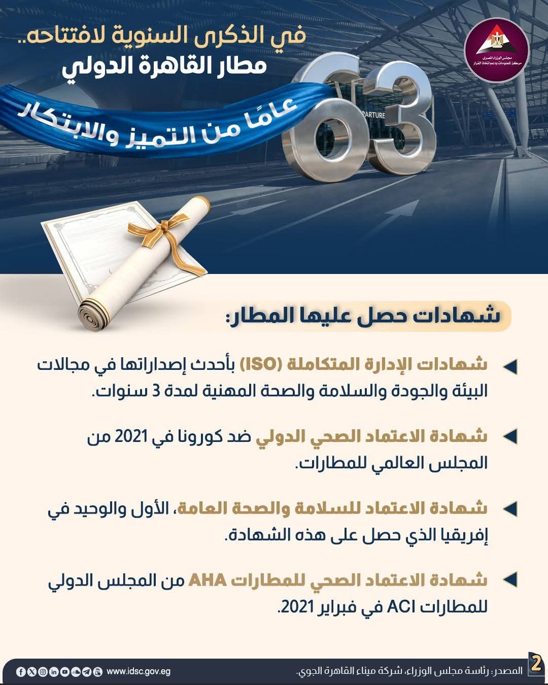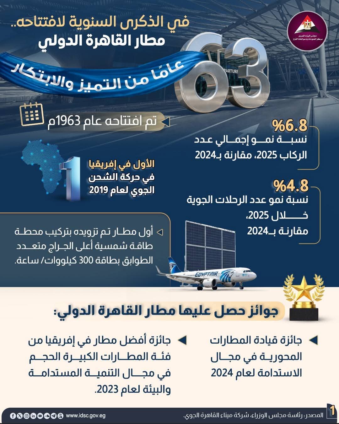 يواصل مطار القاهرة الدولي ترسيخ مكانته كأحد أهم بوابات الطيران في المنطقة. منذ افتتاحه عام 1963، وحقق المطار تطورًا مستمرًا، حيث سجل نموًا في حركة الركاب بنسبة 6.8% والرحلات الجوية بنسبة 4.8% خلال 2025.