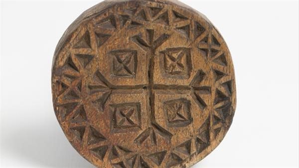 ويُعد الختم، المصنوع من الخشب والمواد العضوية، نموذجًا فريدًا للأختام المستخدمة قديمًا في تأمين وإغلاق الحاويات. ويبلغ قطره نحو 8.4 سم، ويحمل في مركزه نقشًا بارزًا لصليب ذي أربعة أذرع تنتهي بزخارف نباتية، تتخللها أشكال هندسية دقيقة تضم صلبانًا مائلة داخل مربعات، تحيط بها زخارف مثلثية مميزة.
