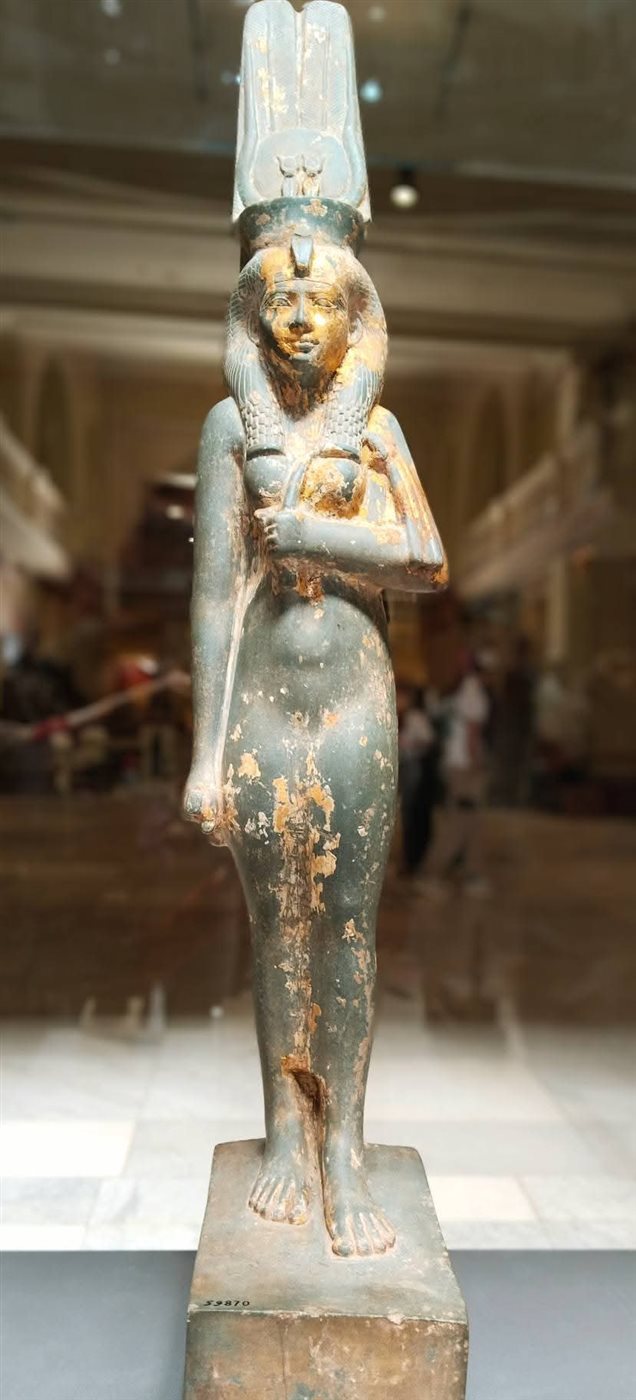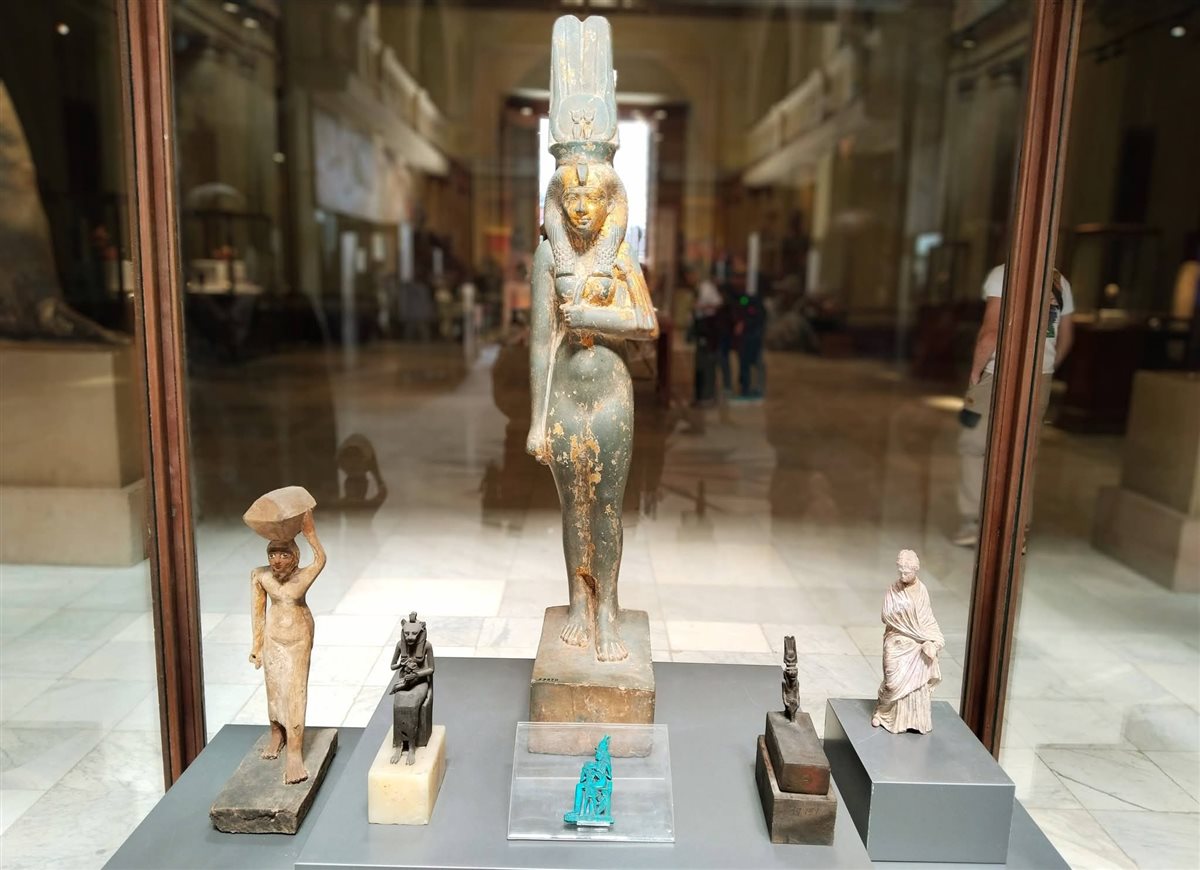 وتبرز بعض القطع الأثرية بالمتحف المصري بالقاهرة هذا التقدير الرفيع في أدق تفاصيله، حيث نجد في "الزوجة الإلهية لأمون"، شب إن وبت الثانية (ابنة الملك بي عنخي من الأسرة 25)، تجسيداً للمكانة الدينية والسياسية الرفيعة التي وصلت إليها المرأة، وهو تمثال مصنوع من الخشب المذهب يعكس هيبة المنصب الكهنوتي.