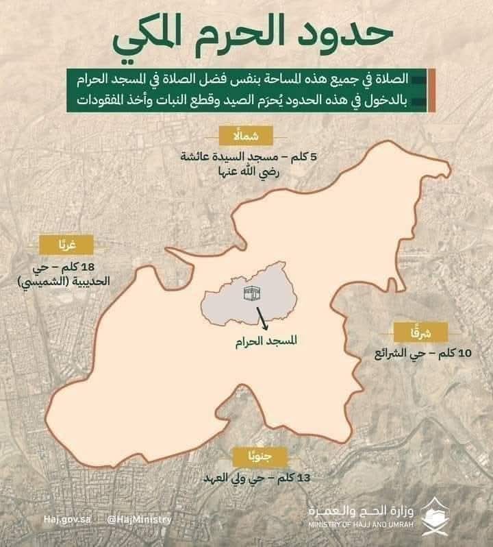 وجاءت حدود الحرم المكي وفقاً للخريطة الجغرافية والمكانية المنشورة عبر الصفحة الرسمية للوزارة على وسائل التواصل الاجتماعي يتوسطهم "المسجد الحرام" على النحو التالي: