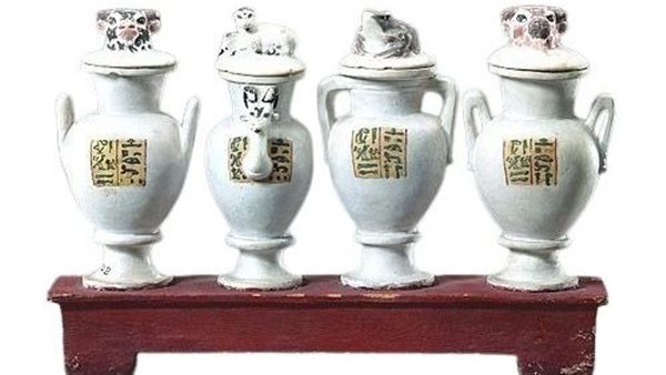 وتتجلى براعة الفنان المصري القديم في تصميم أغطية هذه الأواني، التي حملت رموزًا دينية عميقة؛ إذ تظهر أشكال الضفدع والكبش كإشارات إلى التجدد والبعث، بينما تجسد هيئة العجلين مفهوم ولادة الشمس وبداية يوم جديد في الحياة الأبدية.