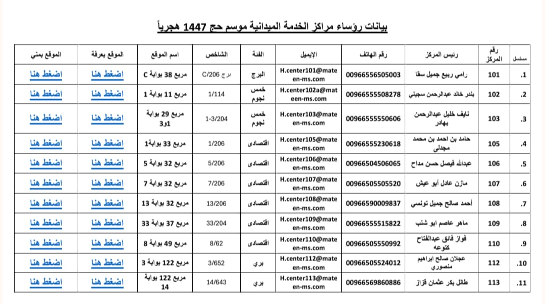 وبناء عليه، فإننا نتشرف بأن نرفق لسيادتكم بياناً تفصيلياً ببيانات رؤساء المراكز ومواقعهم بالمشاعر المقدسة، علماً بأن مقارات مراكز الضيافة بالكامل بمبني شركة الراجحي والكائن بـحي النسيم مجمع تلال النسيم .