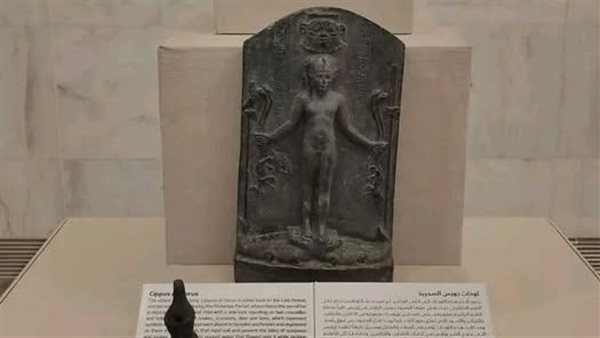 وتضمن اللوحة حورس الطفل يقف فى المنتصف عاريا ساقه اليسرى إلى الأمام يقف فوق تمساحين وفوق رأسه الرمز بس وفى لوحة اخرى على رأسة قرص الشمس وتاج ريشى