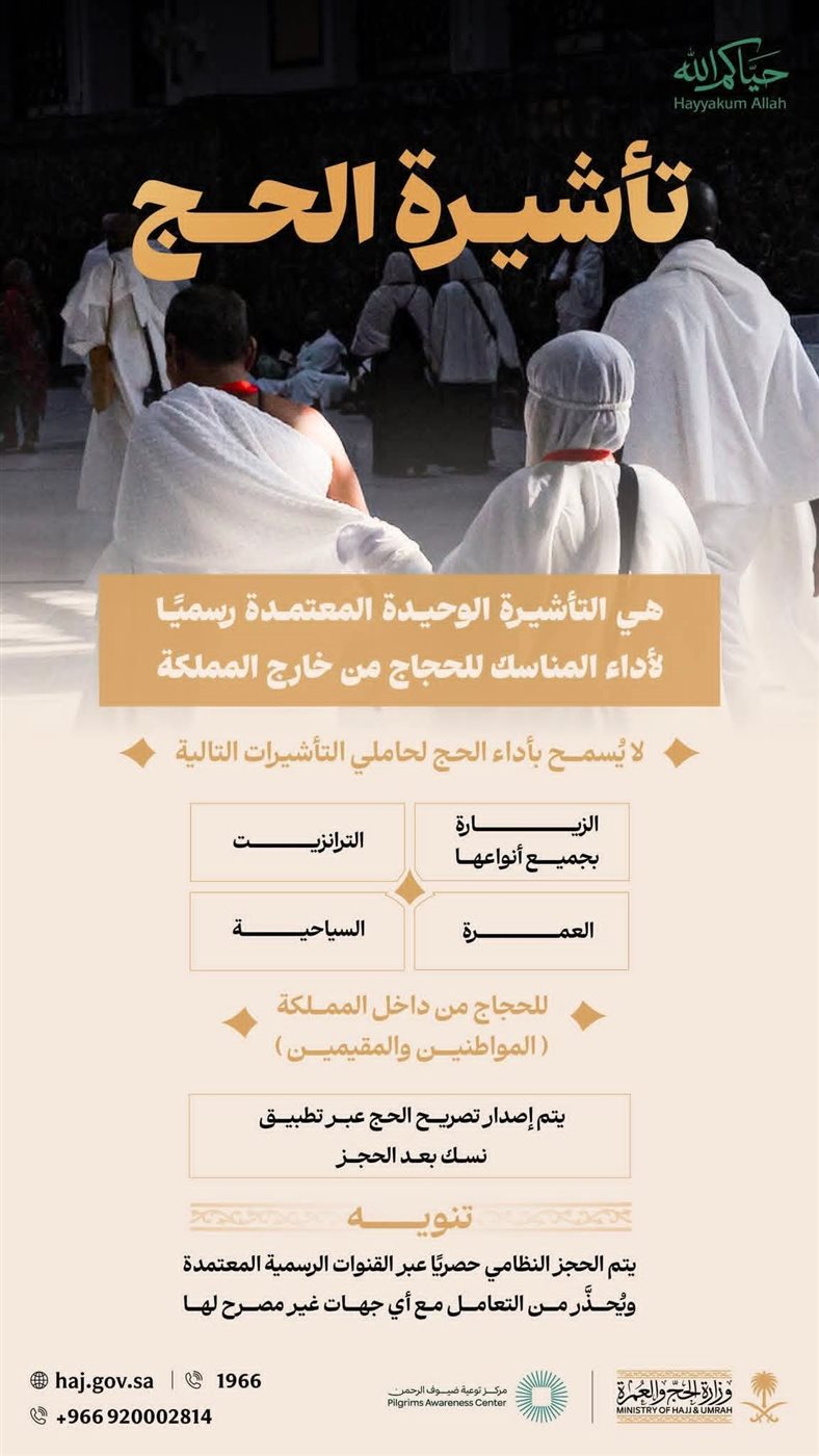 وقالت الحج السعودية في منشور عبر صفحتها على موقع التواصل الاجتماعي فيسبوك، إن تأشيرة الحج هي التأشيرة الوحيدة المعتمدة رسميًا لأداء المناسك للحجاج من خارج المملكة العربية السعودية.