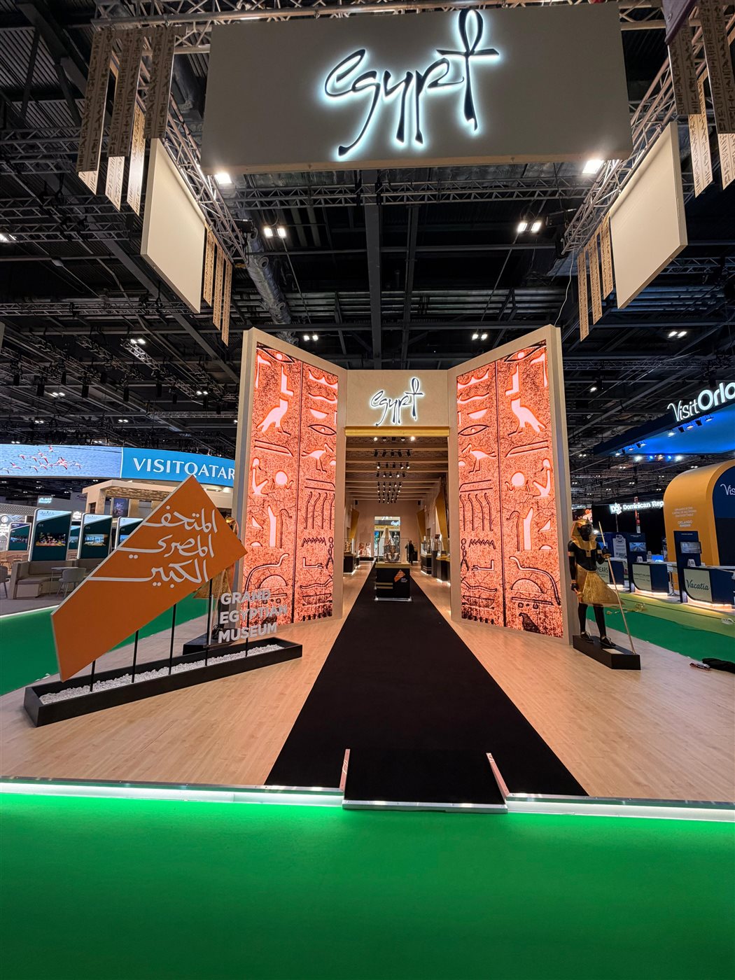 وينقسم الجناح إلى مساحتين رئيسيتين؛ الجزء الأول يمتد على مساحة 400 متر مربع ويضم نموذجًا مصغرًا لإحدى قاعات الملك توت عنخ آمون بالمتحف المصري الكبير احتفالاً بافتتاح المتحف، ليضم 54 مستنسخ أثري لمقتنيات الملك الذهبي أيقونة المتحف وفي نهايته شاشات على شكل هرمي لعرض الأفلام الترويجية عن المقصد السياحي المصري وما يتمتع به من منتجات سياحية متنوعة ومختلفة.