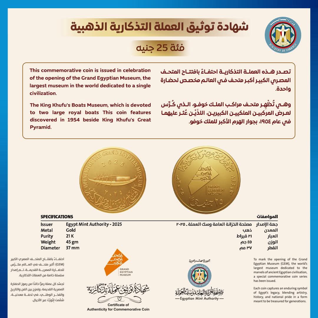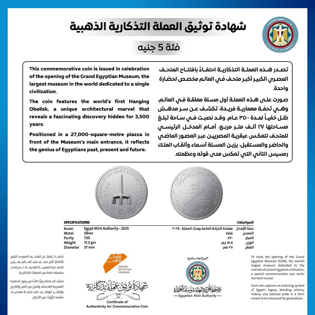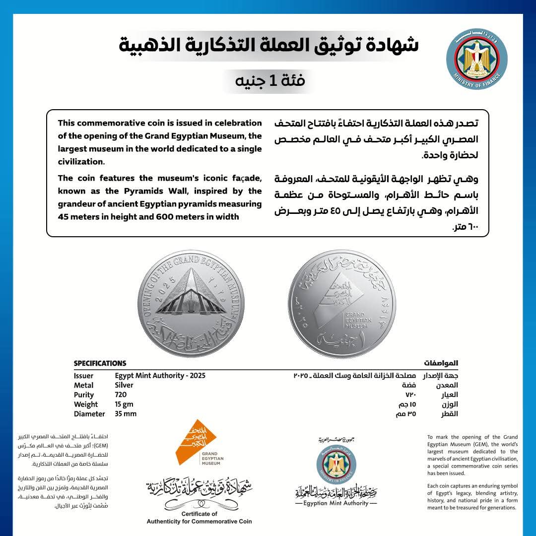قرر وزير المالية، أحمد كجوك، إصدار مزيد من العملات التذكارية بمناسبة افتتاح المتحف المصري الكبير، تلبيةً للطلب المتزايد عليها داخل مصر وخارجها.