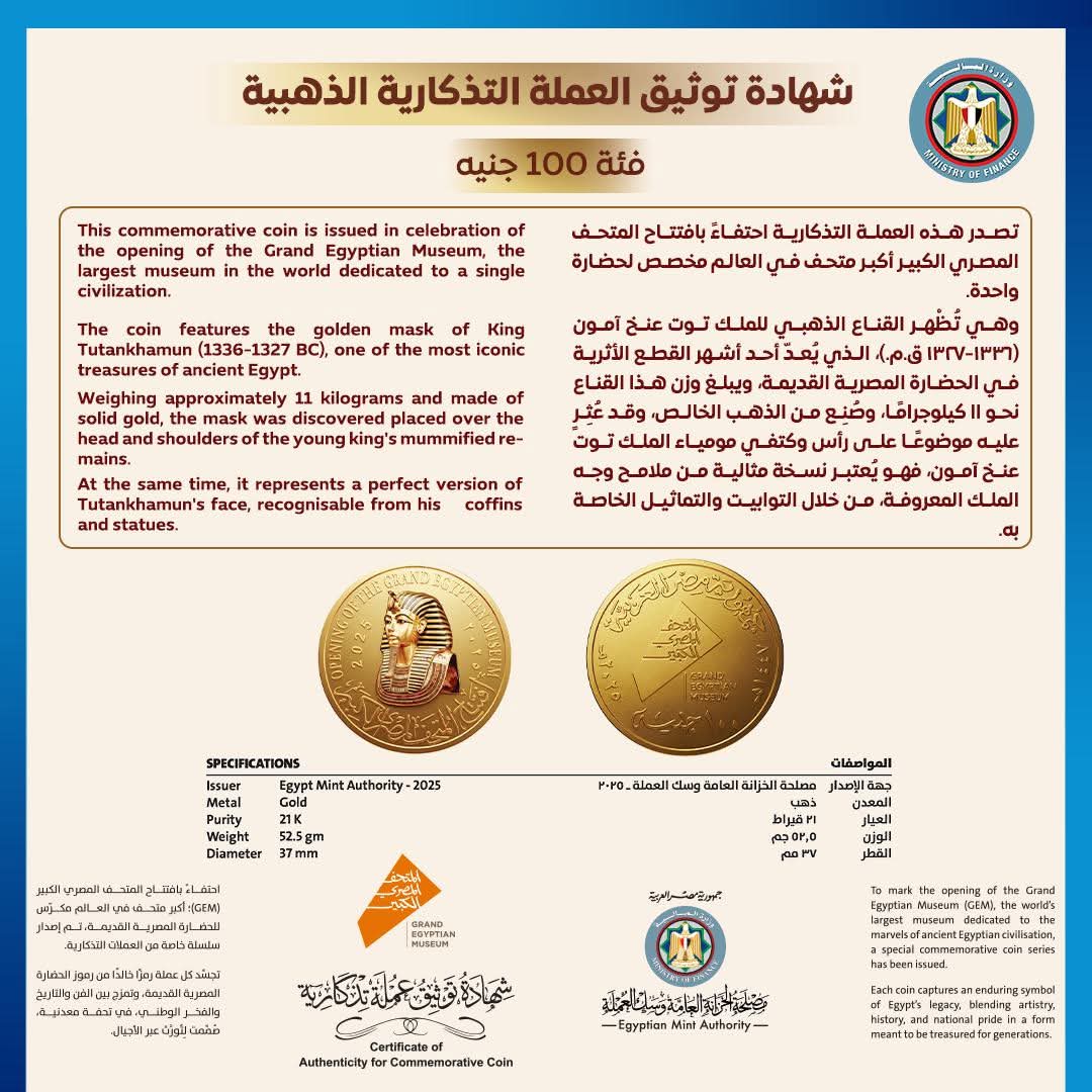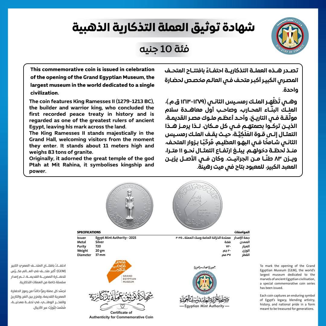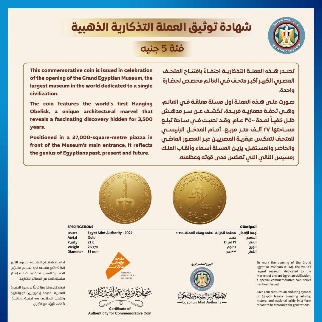 قرر وزير المالية، أحمد كجوك، إصدار مزيد من العملات التذكارية بمناسبة افتتاح المتحف المصري الكبير، تلبيةً للطلب المتزايد عليها داخل مصر وخارجها.