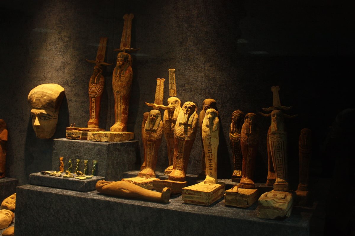 آثار القبر والجنائز: تماثيل وأقنعة جنائزية تمثل العالم الآخر، إضافة إلى تمائم دُفنت مع الميتات وفق المعتقدات المصرية.