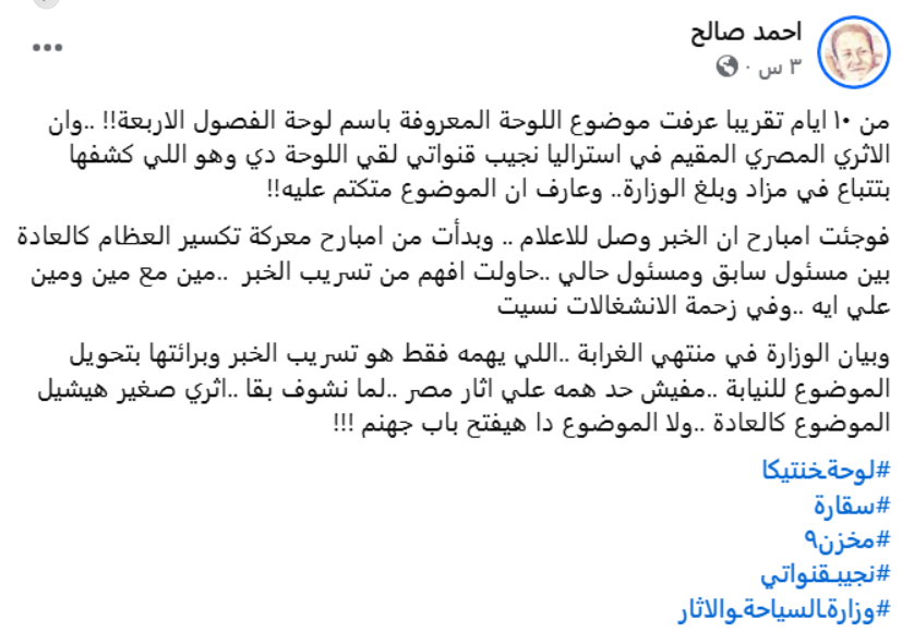 وجاء منشور صالح تعليقًا على اختفاء لوحة أثرية من مقبرة في سقارة، وهي مقبرة خنتي كا ضمن المجموعة الجنائزية للملك تتي.